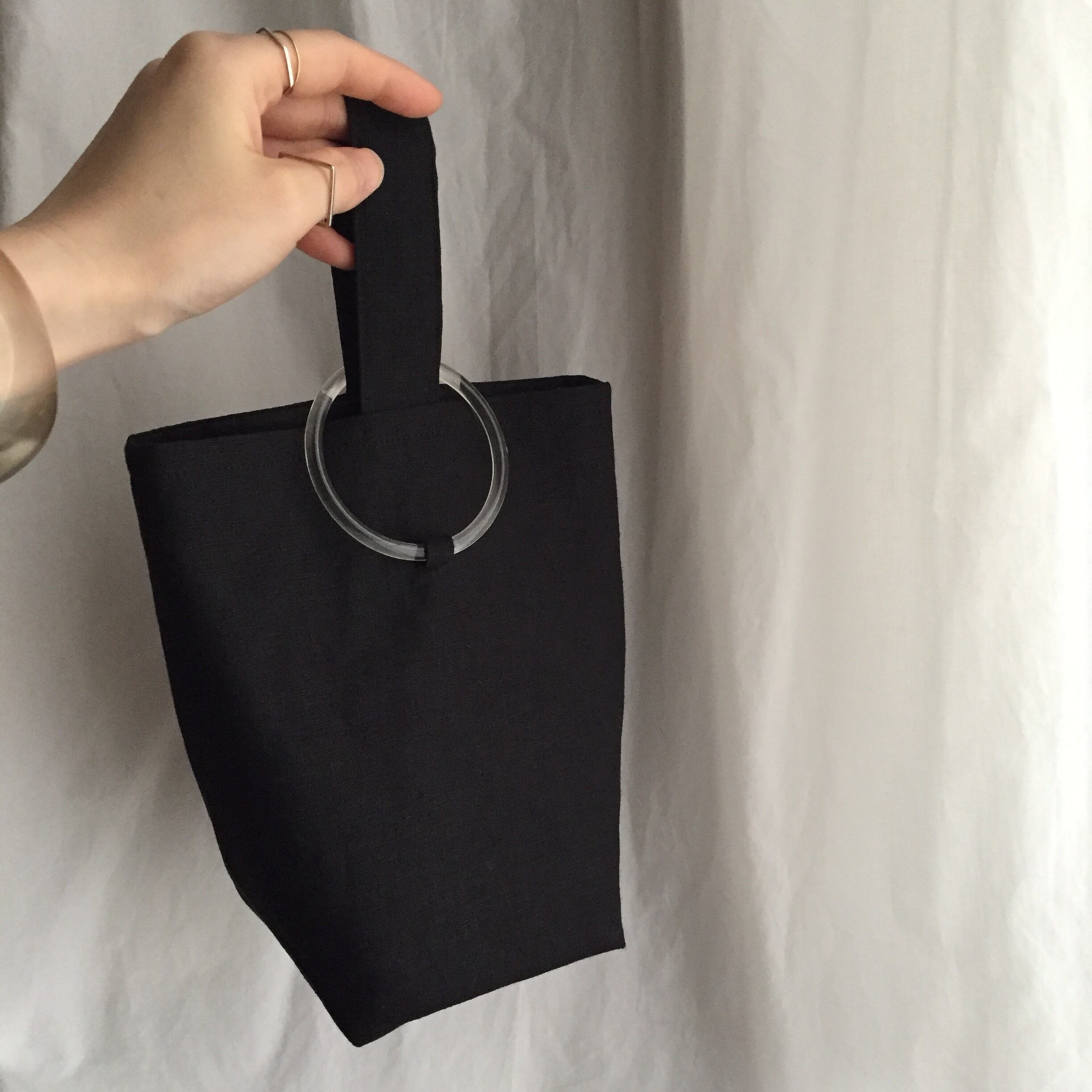ハンドル部分を透明のリングに通してバッグの口を止めるデザインです