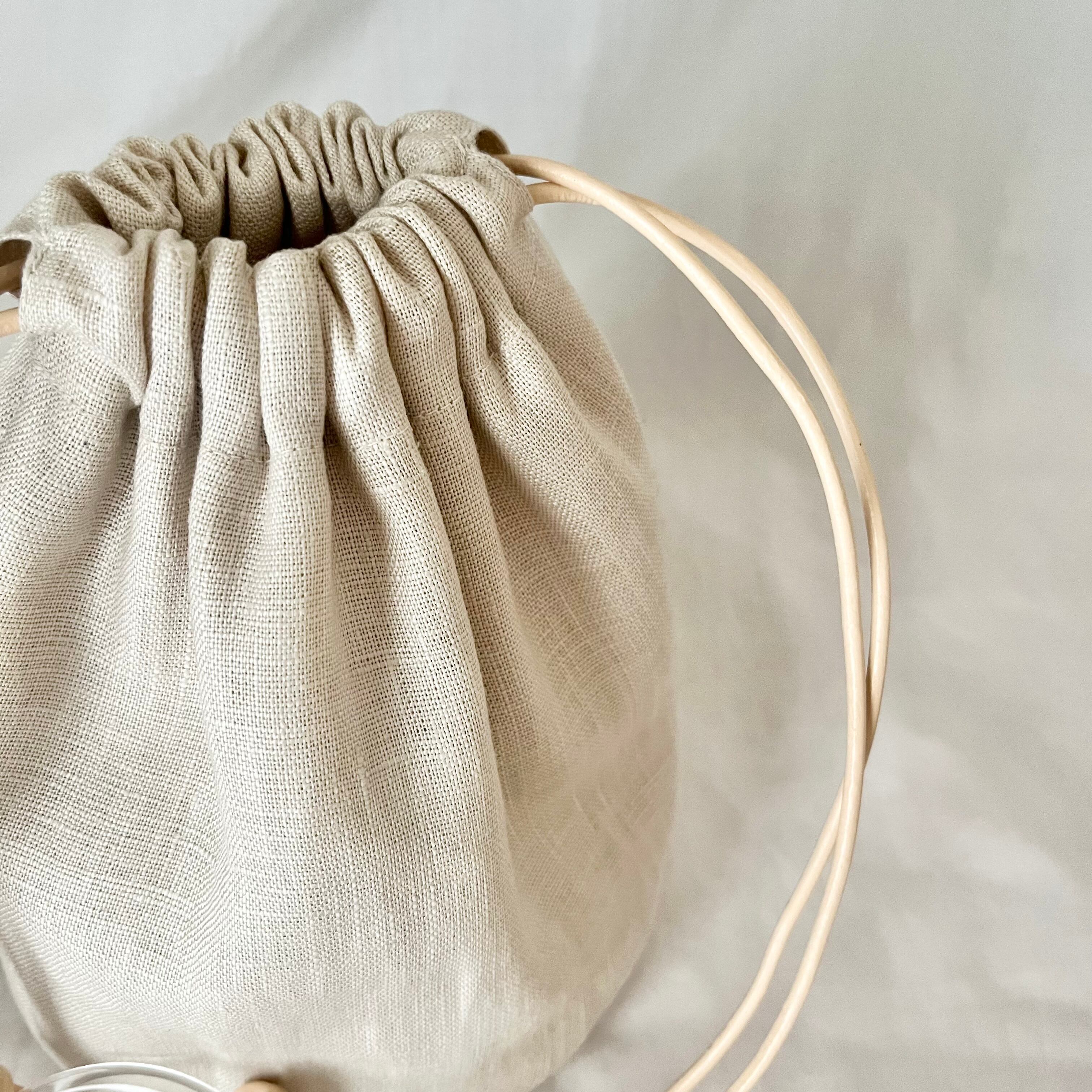 やや厚手のリネンを使用しており、使い初めはハリ感もありますが、芯を入れておりませんのでだんだんと柔らかくなり、くたっとした雰囲気になってもかわいい巾着バッグです